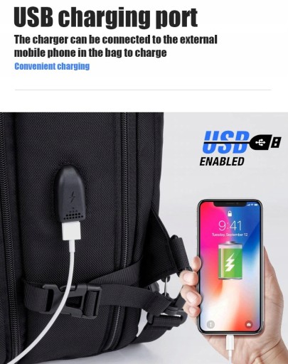 Plecak wyposażony jest w gniazdo usb, dzięki czemu nie ma konieczności wyciągania power banka z plecaka, aby naładować telefon. Uwaga, power bank nie jest częścią zestawu.