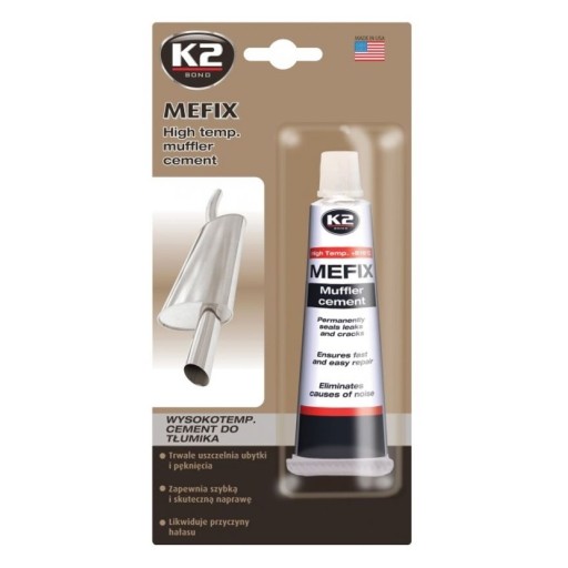 K2 MEFIX to wysokotemperaturowy cement przeznaczony do montażu i napraw zarówno nowych jak i starych układów, rur wydechowych, katalizatorów. Uszczelnia dziury i pęknięcia. Poddany działaniu wysokiej temperatury twardnieje jak stal. Łatwo się rozprowadza. Po utwardzeniu nie kurczy się i nie kruszy, wodoodporny.