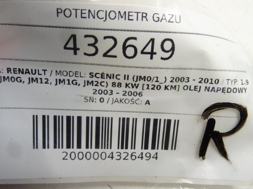 POTENCJOMETR GAZU RENAULT SCÉNIC II 8200159645 1.9 120KM 03-10 PEDAŁ