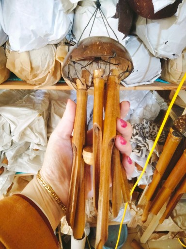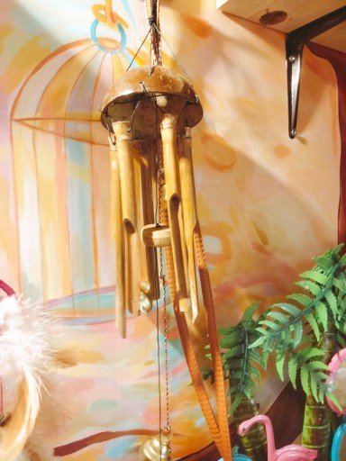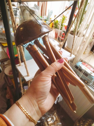 Dzwonki bambusowe oryginalne Indyjskie. Długość najdłuższej rurki to 20 cm. Potem jest przerwa na około 2 cm i kokos czapka. Czapki mogą różnić się odcieniem i kształtem ponieważ to produkt indyjski wykonany z naturalnych elementów . Długość całkowita to około 80 cm. Mają ładne brzmienie. Starannie wykonane i niewielkie rozmiary sprawiają że niewielki podmuch je porusza.