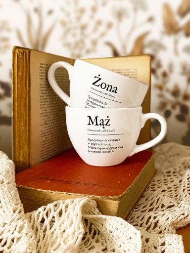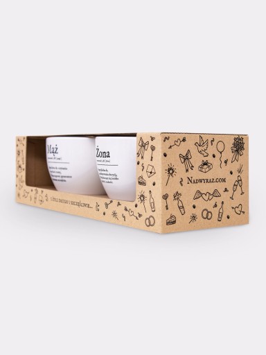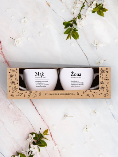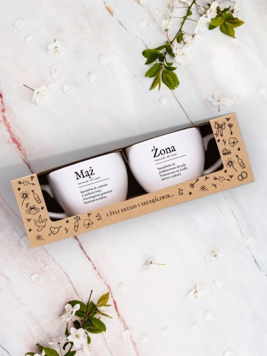 Wyjątkowy zestaw prezentowy dla nowożeńców lub starego dobrego małżeństwa z okazji rocznicy ślubu. W skład zestawu wchodzą dwa eleganckie porcelanowe kubki z definicją słów MĄŻ i ŻONA, które będą piękną, a zarazem praktyczną pamiątką!