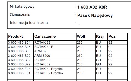 UWAGA - WYSTĘPUJĄ RÓŻNE WERSJE PODANYCH MODELI I MAJĄ INNE PASKI, PROSIMY O SPRAWDZENIE PRZED ZAKUPEM 10-CIO CYFROWEGO NUMERU URZĄDZENIA Z TABLICZKI ZNAMIONOWEJ NA OBUDOWIE MASZYNY Z PODANYMI PRZEZ NAS W ZASTOSOWANIU NUMERAMI.