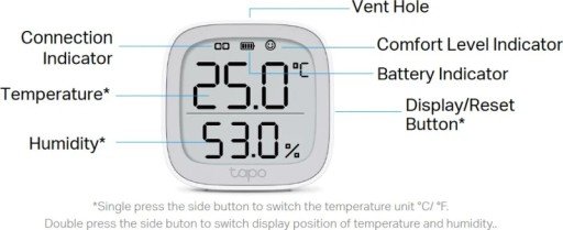 Dokładny monitoring w czasie rzeczywistym - Wykrywa temperaturę i wilgotność z duża dokładnością w czasie rzeczywistym. (Dokładność pomiaru: ±0.3 ºC, ±3% RH). Ekran E-Ink 2.7" - Wyświetla temperaturę, wilgotność, poziom komfortu poprzez ikonkę wyrazu twarzy, poziom baterii i sygnał. Automatyzacja domu - Automatycznie włącza i wyłącza domową elektronikę (np. grzejnik, wentylator, nawilżacz i inne), aby zmaksymalizować Twój komfort i oszczędzać energię. Powiadomienia w aplikacji - Otrzymuj natychmiastowe alerty na swój telefon, gdy zmieniające się warunki wykroczą poza ustalone zakresy. Darmowe przechowywanie danych i Graficzne wykresy - Rejestruj dane dotyczące temperatury i wilgotności, a następnie generuj okresowe podsumowania danych. Łatwy montaż- Umieść urządzenie na biurku, lub zamontuj na ścianie. Wymagany Hub - Hub Tapo jest wymagany do obsługi funkcji Smart, takich jak zdalny monitoring, automatyzacja domu, eksport danych i wielu więcej.