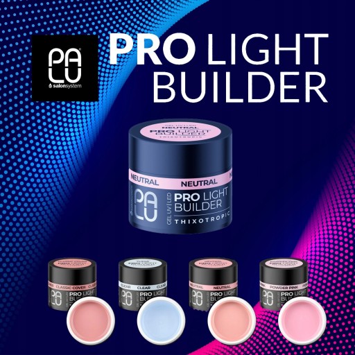 PRO LIGHT BUILDER GEL to żel, który posiada właściwości produktu bazowego, budującego i nabłyszczającego. W swojej budowie zawiera substancje adhezyjne, które zwiększają przyczepność do naturalnej płytki paznokcia, substancje budujące i nabłyszczające. Aby osiągnąć optymalny efekt przyczepności przy cienkich, problematycznych płytkach warto zastosować wcierkę z dowolnej bazy Palu.