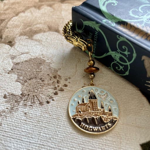 Unikatowy prezent dla fana książek o Harrym Potterze :) - zakładka do książki z emaliowaną zawieszką z zamkiem Hogwarts . Zakładka wykonana z elementów metalowych w kolorze złota i starego złota, ozdobiona hematytami. Baza zakładki w kształcie smoka. Długość elementu ozdobnego 5 cm. Długość zakładki 12 cm.
