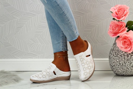 Damskie klapki w kolorze białym na niskim koturnie z ozdobnym ażurowym wzorem. Wszyta guma pozwala dostosować obuwie do różnych tęgości stopy. Idealnie sprawdzą się jako obuwie codzienne oraz na ciepłe dni. Profilowana wkładka zapewnia stopie wygodę. Szyta podeszwa skutkuje dłuższą wytrzymałością obuwia.