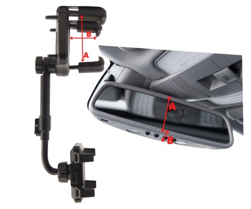 Regulacja zaczepu, tak aby dopasować się praktycznie do każdego lusterka. Wymiary: A-7,5 cm ; B - 6 cm