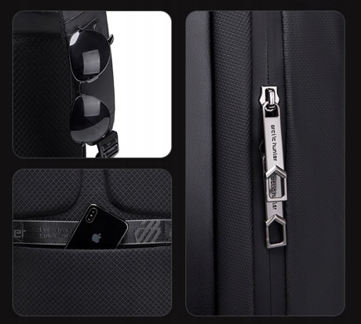 Plecak Arctic Hunter B00487 wykonano z wytrzymałego, impregnowanego materiału, dzięki czemu jest trwały i wodoodporny. Dodatkowe zabezpieczenie dla przenoszonych rzeczy stanowi przód plecaka, który został wykonany z twardego materiału EVA. Plecak posiada jedną komorę, która otwiera się pod kątem 90 stopni i jest zabezpieczona antykradzieżowym zamkiem TSA Lock. Wewnątrz znajduje się dedykowana, miękka kieszeń na laptop w rozmiarze do 15,6" oraz druga mniejsza kieszeń na tablet - obie zabezpieczone są elastyczną taśmą zapinaną na rzep. Po drugiej stronie komory znajdują się kieszonki na akcesoria i organizer na długopisy, oraz przestrzeń na zapakowanie rzeczy i ubrań. Zamek głównej komory jest dodatkowo zabezpieczony przed przemakaniem. Z tyłu plecaka umieszczono bezpieczną kieszeń na portfel lub telefon oraz nylonowy pas, dzięki któremu można założyć plecak na rączkę torby lotniczej. Szelki i plecy plecaka wyłożone są gąbkami zwiększającymi komfort w trakcie noszenia, a na jednej z szelek znajduje się zaczep na okulary. Plecak mamożliwość powiększenia poprzez rozpięcie dodatkowego zamka, dzięki czemu jego pojemność wzrasta. Plecak jest wyposażony w zewnętrzne złącze USB, dzięki czemu nie ma konieczności wyciągania power banka z plecaka, aby naładować telefon lub inne przenośne urządzenie. Złącze to jest ogumowane i zamykane na klapkę, dzięki czemu jest chronione przed zamoknięciem.
