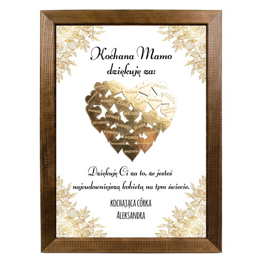 Środek ramki wypełnia ZŁOTE LUSTRZANE SERCE 3D, które składa się z mniejszych serduszek, na których wygrawerowane są teksty z podziękowaniami.