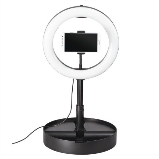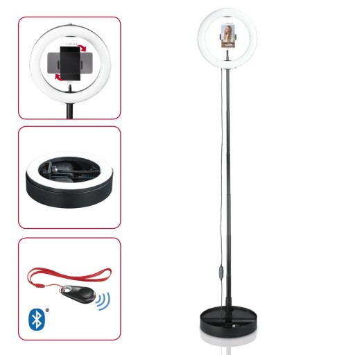 Optymalne oświetlenie do wykonywania tutoriali makijażowych lub portretów selfie. Lampa na swojej minimalnej wysokości 52 cm może być używana również jako statyw stołowy. Zawsze idealna pozycja do nagrywania: do wyboru pionowy lub poziomy format dzięki uchwytowi do smartfona z głowicą kulową i elastycznym wspornikiem. Oświetlenie pierścieniowe 10.2" (zewnętrzna średnica 26,5 cm) z 128 LEDami. Wskazówki dla użytkownika:. Funkcja wyzwalacza Bluetooth jest uzależniona od oprogramowania Twojego urządzenia. Prosimy o wcześniejsze sprawdzenie w informacji dostarczonej przez producenta lub w internecie, czy Twój smartfon wspiera działanie zdalnego wyzwalacza do zdjęć..