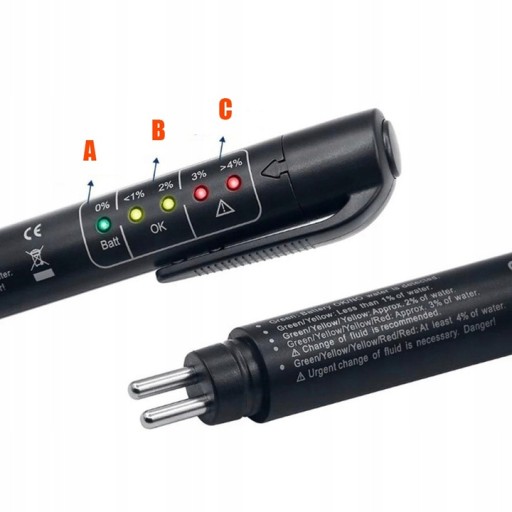 Kompaktowy tester płynu hamulcowego. Umożliwia błyskawiczny pomiar zawartości wody w płynie hamulcowym, niezależnie od posiadanego modelu samochodu. Wystarczy zanurzyć elektrody testera w zbiorniczku z płynem hamulcowym i odczytać wskazanie diod kontrolnych. Urządzenie jest w stanie przetestować wiele rodzajów płynów hamulcowych (DOT 3, DOT 4, DOT 5, DOT 5.1).
