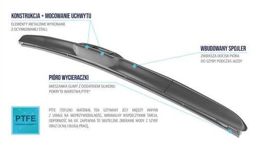 • Pióro wycieraczki wykonane z naturalnego kauczuku z dodatkiem silikonu oraz warstwy PTFE (teflon) zapewnia skuteczne zbieranie wody z szyby oraz cichą i długą pracę,