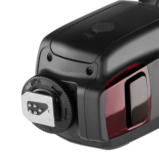 - Gniazdo do podłączenia battery packa typu CP-E3 lub CP-E4, dzięki czemu skraca się czas ładowania lampy i zwiększa ilość błysków seryjnych.