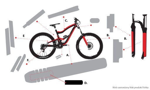 Opakowanie zawiera zestaw folii o kształtach dopasowanych do rowerów zjazdowych downhill.
