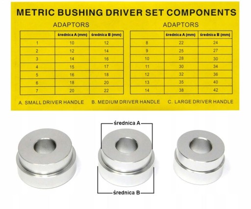 Zestaw znajdzie zastosowanie w serwisach samochodowych oraz ślusarskich do pobijania łożysk i uszczelniaczy. Może być również wykorzystywany przy prasach hydraulicznych do wciskania i wyciskania osiowego elementów np. łożysk, tulei itp.