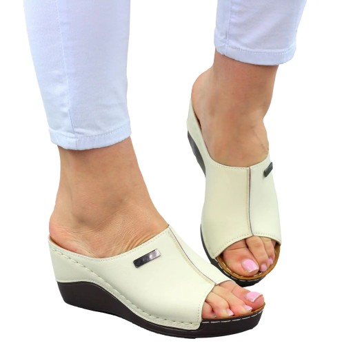 Damskie klapki w kolorze kremowym na wysokim koturnie wsuwane. Idealnie sprawdzą się jako obuwie codzienne. Z łatwością dopasują się również do eleganckich stylizacji. Profilowana wkładka zapewnia komfort użytkowania. Szyta podeszwa skutkuje dłuższą wytrzymałością obuwia.