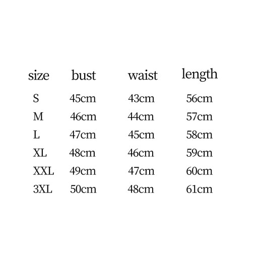 XXXL: obwód klatki piersiowej 50 cm/19,69 cala, talia 48 cm/18,90 cala, długość 61 cm/24,02 cala