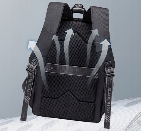 Dwukomorowy plecak Arctic Hunter B00498 to kolejny model wykonany z Nylonu 1680D, zwanego nylonem balistycznym. To najmocniejszy i najtrwalszy nylon dostępny na rynku, dzięki czemu plecak cechuje wysoka odporność zarówno na urazy mechaniczne, jak i warunki atmosferyczne oraz promienie UV. Z tyłu plecaka znajduje się miękka kieszeń na laptop w rozmiarze do 16,4" i kieszeń na tablet do 10” (obie zapinane na pasek z rzepem) oraz dwie kieszonki na akcesoria. W drugiej komorze znajduje się przestrzeń na zapakowanie ubrań lub większych rzeczy, które można zabezpieczyć spinanymi, elastycznymi paskami. Umieszczono tutaj również dużą siatkową kieszeń na akcesoria. Z przodu plecaka znajduje się mniejsza kieszeń z organizerem na podręczne rzeczy i długopisy. Po bokach plecaka znajdują się elastyczne kieszenie przeznaczone na napój lub parasolkę. Z tyłu plecaka umieszczono nylonowy pas, dzięki któremu można założyć plecak na rączkę torby lotniczej. Szelki i plecy plecaka wyłożone są gąbkami zwiększającymi komfort w trakcie noszenia. Na jednej z szelek znajduje się zaczep na okulary. U góry plecaka znajduje się solidny uchwyt służący do przenoszenia plecaka w ręce.