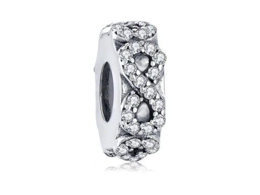 Elegancki wykonany z rodowanego srebra charms pasujący do bransolet modułowych, o okrągłym kształcie przyozdobionym symbolami nieskończoności, wysadzanymi białymi cyrkoniami.