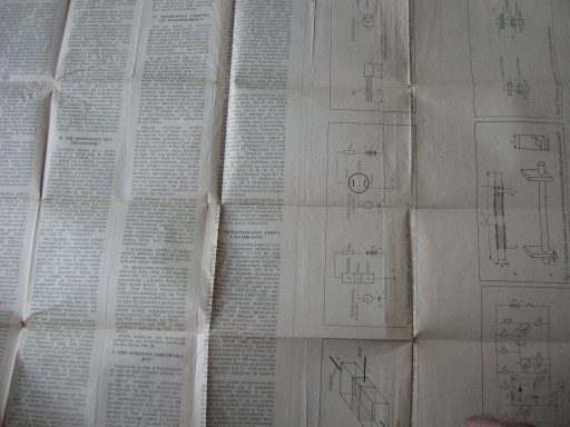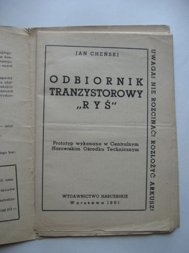 Rozkładany arkusz z planem i opisem wykonania i konstrukcji odbiornika Ryś, z popularnej w latach 60 i 70-Tych serii wydawniczej dla początkujących konstruktorów i majsterkowiczów