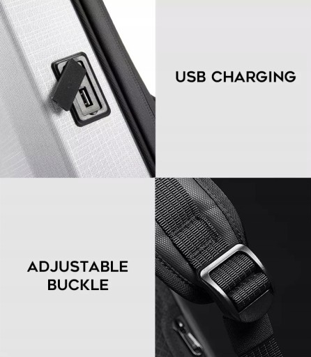 Plecak marki Bange o symbolu BG-2839 to wyjątkowy, antykradzieżowy plecak typu kapsuła. Wykonany został z wodoodpornego materiału EVA, a główny zamek plecaka został dodatkowo zabezpieczony przed przemakaniem. Plecak w całości jest usztywniany, dzięki czemu doskonale chroni zawartość przed uderzeniami. Zapięcie głównej komory plecaka jest zabezpieczone zamkiem szyfrowym TSA lock. Plecak można otworzyć pod kątem 30° (zapięcie zabezpieczające na rzepy), 90° lub 180° (jak walizkę). Wewnątrz znajduje się sporo miejsca na rzeczy oraz kieszeń na laptopa w rozmiarze do 15,6”, kieszeń na tablet do 10” (obie zapinane na elastyczny pasek z rzepem), dwie kieszenie na drobiazgi oraz jedna zapinana na zamek. Znajduje się tu również łącze do power banka z zewnętrznym gniazdem USB, znajdującym się z boku plecaka. Tył plecaka wyłożono oddychającymi, grubymi gąbkami, aby był wygodny przy dłuższym noszeniu. Szelki plecaka o ergonomicznym kształcie są solidnie uszyte i wyłożone miękkimi gąbkami, aby plecak dobrze układał się na ramionach nawet przy dużym obciążeniu. Na plecach znajduje się dyskretna kieszeń zapinana na zamek. Na obu szelkach umieszczono pasek do zahaczenia okularów. Plecak BANGE BG-283 polecamy osobom, które potrzebują małego, zgrabnego plecaka na laptopa, świetnie zabezpieczonego przed kradzieżą i deszczem.