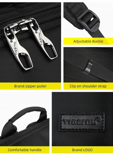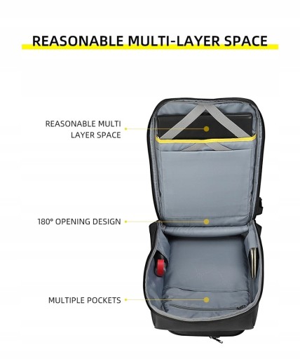 Plecak Tigernu T-B3966 ochrona RFID i USB jest wykonany z wodoodpornego materiału odpornego zarówno na przecięcia jak i przedarcia. Wymiary i konstrukcja plecaka umożliwiają wykorzystywanie go jako bagażu podręcznego - można go otworzyć na płasko, jak walizkę, co ułatwia zapakowanie większej ilości rzeczy. Plecak posiada dwie komory. Większa komora wyposażona jest w dedykowaną, miękką kieszeń do przenoszenia w niej laptopa oraz mniejsza kieszeń np. na tablet. Obie są zabezpieczone elastycznymi taśmami zabezpieczającymi sprzęt przed wypadnięciem. W komorze tej znajduje się również kilka mniejszych kieszeni. W drugiej, mniejszej komorze umieszczono dwie kieszonki oraz odpinany zaczep np. na klucze. Z przodu plecaka znajduje się mała kieszeń zapinana na zamek. Po bokach plecaka znajdują się dwie kieszenie zapinane na zamek, w jednej z nich znajduje się złącze do power banka z zewnętrznym gniazdem USB. Zarówno szelki, jak i plecy wyłożone są gąbkami zwiększającymi komfort w trakcie noszenia. Na jednej z szelek znajduje się malutka kieszonka zapinana na zamek. Na plecach pod szelkami znajduje się dyskretna kieszeń zapinana na zamek z wbudowanym systemem RFID oraz pas umożliwiający założenie plecaka na rączkę torby podróżnej.