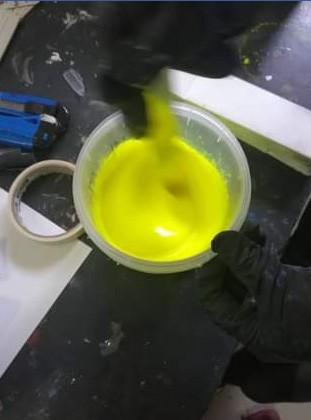 Najlepszym rozwiązaniem jest pokrycie lakierowanych elementów czystą białą bazą i na tak przygotowany element nanosić lakier fluorescencyjny.