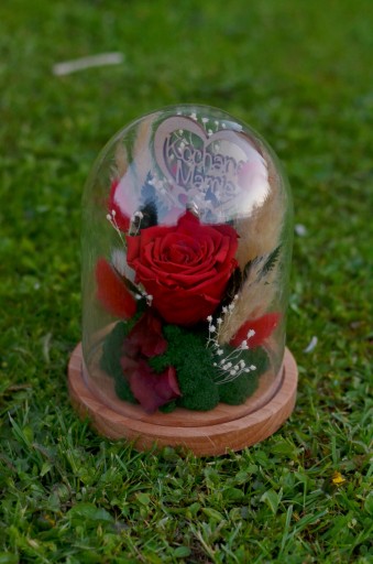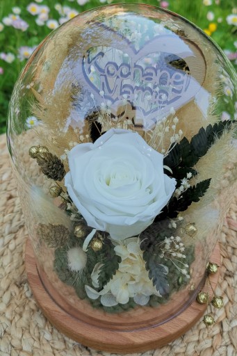 Klosz z różą ma wysokość 19 cm średnica kopuły 12 cm średnica drewnianej podstawy 14 cm. Dzięki temu kształt róży jest dobrze wyeksponowany. Przyciąga wzrok a jednocześnie nie zajmuje dużo miejsca na blacie biurka, komody czy kawowego stolika.