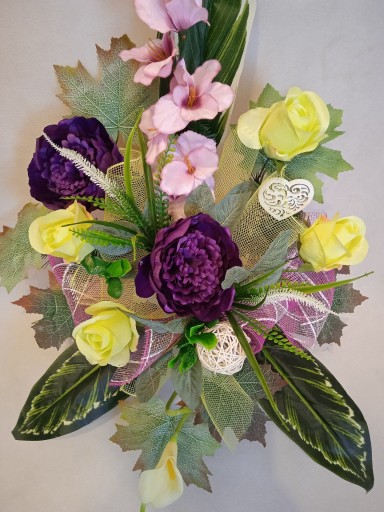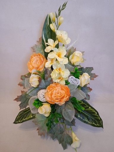 Wykonany na uniwersalnym flakonie plastikowym zabetonowanym z choiną sztuczną, gotowy tylko do włożenie do wazonu! Flakon ma średnice 12 cm od góry i 7 cm od dołu, ma 10 cm wysokości. Kompozycja do wazonu ma ok. 65 cm wysokości i 45 cm szerokości.