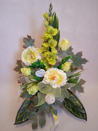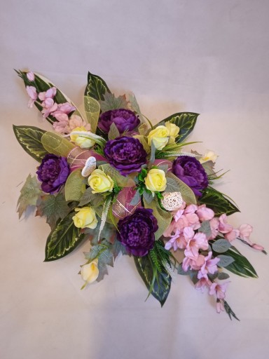 Kompozycja sztuczna (tzw. stroik, ikebana) jest wykonana z sztucznej choiny w doniczce plastikowej co daje jej stabilność.