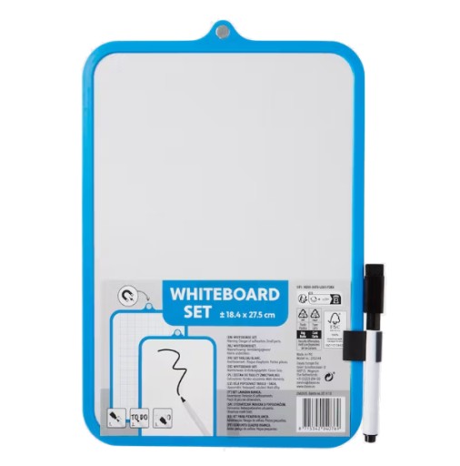Tekst zapiszesz przy pomocy czarnego markera , który znajduje się w zestawie a tekst usuniesz dzięki załączonej do pisaka gąbce