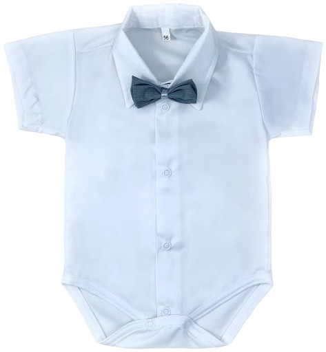 Białe, wizytowe koszulo-body z kołnierzykiem i krótkimi rękawkami dla chłopczyka. Szara mucha na wstążeczce. Możliwość wymiany koloru muchy na inny dostępny na aukcjach.