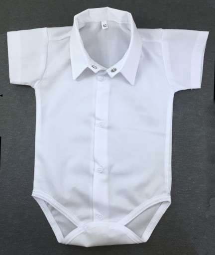 Białe, wizytowe koszulo-body z kołnierzykiem i krótkimi rękawkami dla chłopczyka. Biała mucha na wstążeczce. Możliwość wymiany koloru muchy na inny dostępny na aukcjach.