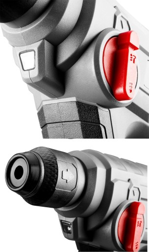 Młotowiertarka posiada funkcję "click" do szybkiego mocowania wiertła. Rękojeść główna pokryta jest antypoślizgową nakładką, dzięki czemu elektronarzędzie pewnie leży w dłoni.