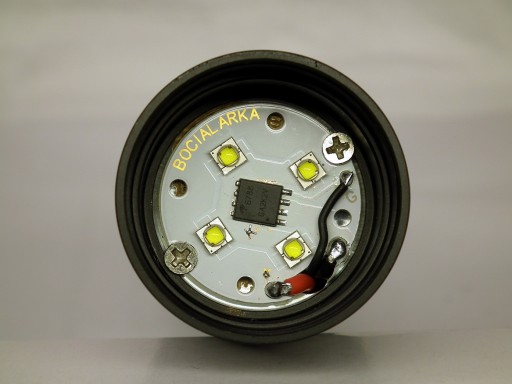 Prąd zasilający LED nie jest uzyskiwany modulowanym sygnałem PWM a regulowanym prądem stałym. Ma to szereg zalet takich jak: wykorzystanie wyższej sprawności lm/W diody LED zasilanej niskim prądem stałym, dłuższy czas pracy na akumulatorze (pobieramy stałą wartość a nie męczymy go wysokimi szpilkami prądowymi), brak często słyszalnego sygnału PWM, latarka nie zakłóca innych urządzeń pracujących w sąsiedztwie (np. bezprzewodowe liczniki rowerowe).