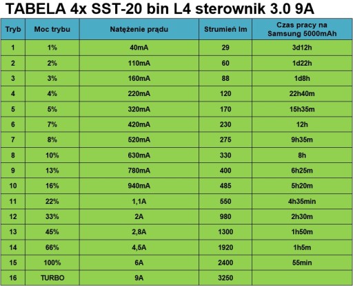 Poniżej tabela dostępnych trybów sterownika rozszerzonego 3.0 9A dla 4 diod SST-20 bin L4 oraz zasilania ogniwem Samsung INR21700-50E 5000mAh