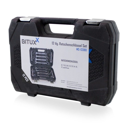 Zestaw składa się z 12 kluczy wykonanych z trwałej i odpornej stali chromowo-wanadowej i dostarczany jest w solidnej walizce z tworzywa sztucznego.