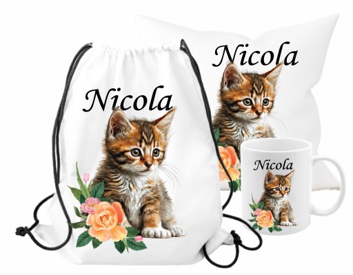 ZESTAW PODUSZKA KUBEK WOREK KOT KOTY KOTKI IMIĘ