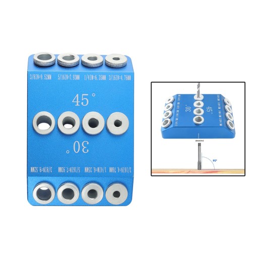 [4 ROZMIARY OTWORÓW]: Przyrząd prowadzący wiertła Z 4 różnymi rozmiarami otworów: 3/8 "(9.52mm), 5/16" (7.93mm), 1/4 "(6.35mm) i 3/16" (4.76mm ), można z łatwością wiercić otwory o różnych rozmiarach.