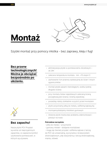 Montaż płytek proplast wykonuje się jedynie gumowym młotkiem! Przycinanie płytek proplast wykonuje się brzeszczotem do metalu, wyrzynarką, tarczą diamentową lub gilotyną do paneli.