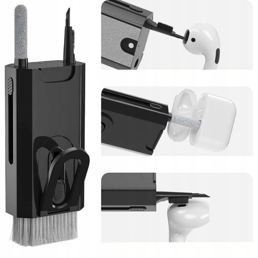 Czyścik Wielofunkcyjny zestaw czyszczący 8w1, który idealnie usunie wszelki zewnętrzny bród, kurz czy tłuste ślady na ekranie Twojego telefonu, laptopa czy ze słuchawek. Doskonale wyczyści trudno dostępne miejsca - porty, głośniki, słuchawki typu airpods.