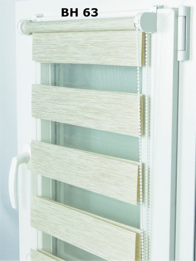 Tkanina składa się z naprzemiennie utkanej tkaniny (75mm) i siatki przeźroczystej (50mm), co pozwala nam na dowolną regulację pomieszczenia. Roletą można pomieszczenie całkowicie przysłonić, częściowo lub można ją całkowicie zwinąć.