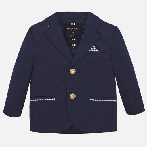 Marynarka lniana dla dzieci idealna do eleganckich stylizacji zapinana na guziki, z imitacją kieszeni dla chłopców Mayoral z kolekcji baby boy z sezonu wiosna lato kod produktu 1453 kolor 29 Granatowy. Ubranka dla dzieci.