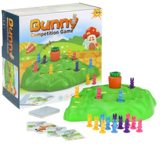 - Zielony pagórek należy umieścić na środku stołu. Każdy z graczy ma do wyboru 4 króliczki z tego samego koloru. Może grać maksymalnie 4 graczy, jeśli w zabawie uczestniczy mniej osób, pozostałe króliczki należy schować do pudełka.
