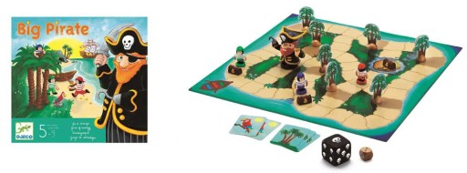 Gra planszowa Piraci Djeco. Gra Piraci to zabawa taktyczna dla 2-4 graczy, którzy mają za zadanie wcielić się w rolę pirata lub śmiałków. Śmiałek musi zabrać skarb pirata, natomiast sam pirat stara się mu to utrudnić i próbuje zabrać statki. Runda trwa około 20 minut.