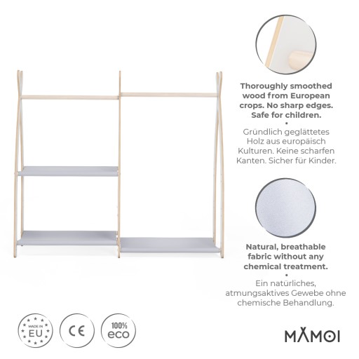 Wieszak na ubrania Mamoi wykonano w sposób bezpieczny dla dzieci oraz środowiska naturalnego przy wykorzystaniu wysokiej jakości, certyfikowanych preparatów. Produkt utrzyma obciążenie do 10 kg. Precyzyjne dopasowanie każdego z elementów, gładkie krawędzie i delikatny materiał zapobiegają skaleczeniu się i zapewniają bezpieczeństwo. W zestawie znajdują się boki konstrukcji, drążki, jasnoszary materiał oraz metalowe elementy montażowe. Jasnoszary odcień gwarantuje stylowy i ponadczasowy wygląd. Prosty kształt gwarantuje ponadczasowość i uniwersalność.