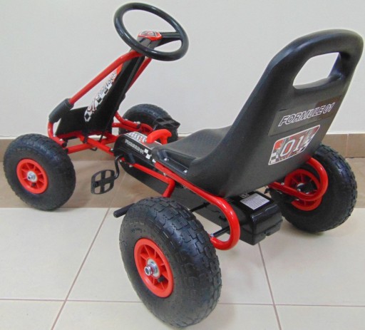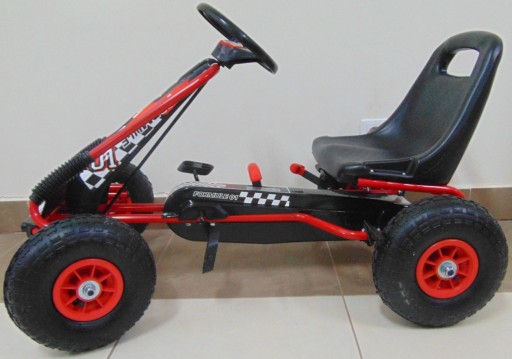 Gokart na pedały z pompowanymi kołami i hamulcem ręcznym. Przeznaczony dla dzieci od 3-7 lat, do wagi 30kg.