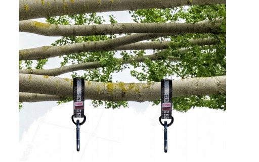 Zestaw montażowy do hamaków oraz huśtawek ogrodowych składający sie z dwóch wytrzymałych pasków oraz dwóch karabińczyków.