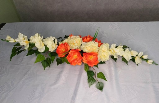 Wiązanka nagrobna wykonana ręcznie z wysokiej jakości sztucznych kwiatów w donicy zalanej betonem.
