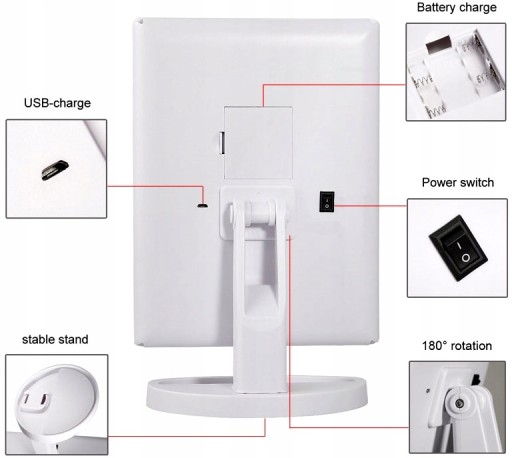 - Aż 22 diody LED! Diody zapewniają odpowiednie oświetlenie potrzebne na przykład podczas wykonywania makijażu.